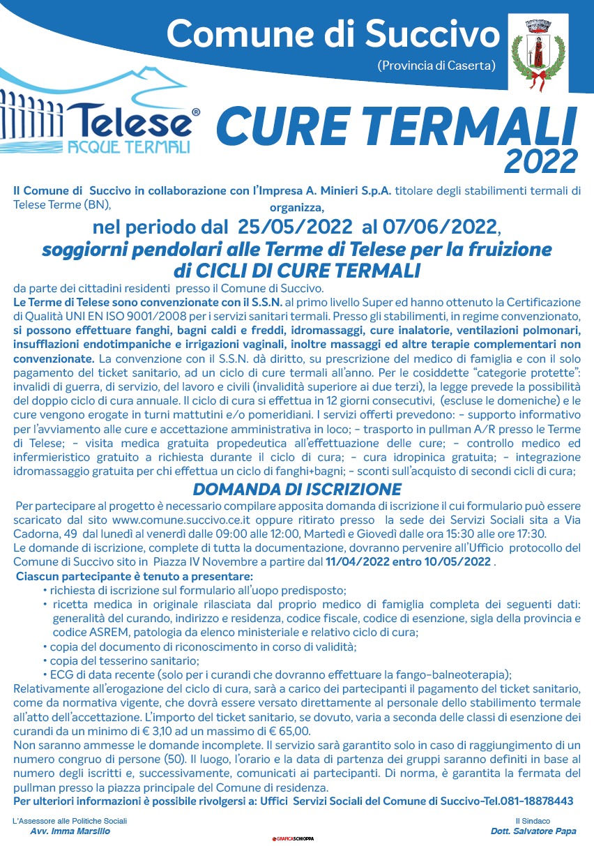 Il Comune di Succivo, in collaborazione con l’Impresa A. Minieri S.p.A. titolare degli stabilimenti termali di Telese Terme (BN), organizza, nel periodo dal 25 Maggio 2022 al 7 Giugno 2022 Settembre, soggiorni pendolari alle Terme di Telese per la fruizione di CICLI DI CURE TERMALI da parte dei cittadini residenti presso il Comune di Succivo. Per partecipare al progetto è necessario compilare apposita domanda di iscrizione il cui formulario può essere scaricato sito www.comune.succivo.ce.it oppure ritirato presso la sede dei Servizi Sociali sita a Via Cadorna, 49, dal lunedì al venerdì dalle 09:00 alle 12:00, Martedì e Giovedì dalle ore 15:30 alle 17:30 . Le domande di iscrizione, complete di tutta la documentazione, dovranno pervenire all’Ufficio protocollo del Comune di Succivo sito a Piazza IV Novembre, entro il 10/05/2022 h 12:00